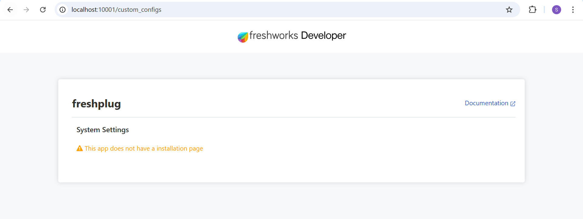 Do you have either of these files in your project: iparams.json or iparams.html? If yes, please paste this URL (http://localhost:10001/custom_configs) into your browser, and you will be able to view your settings page.
