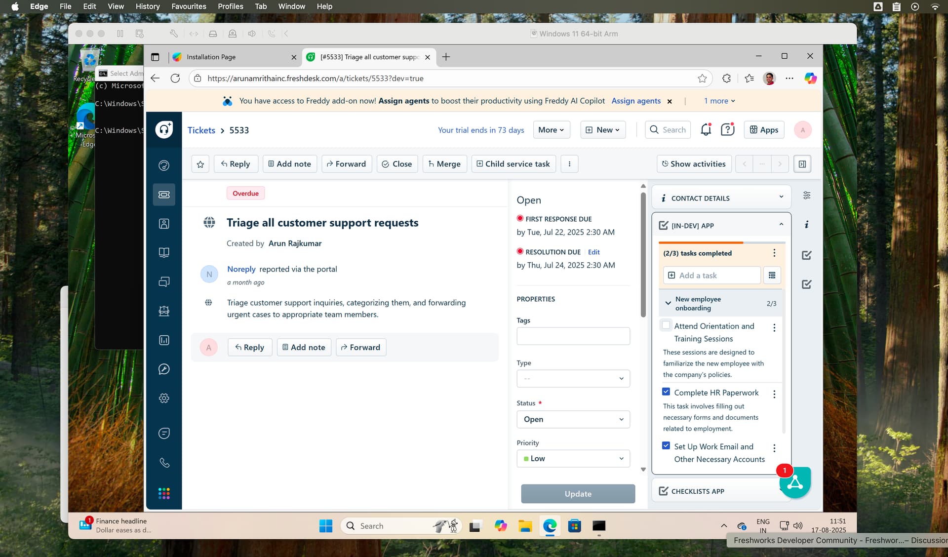 In this screenshot, the app is running in the ticket sidebar location of a Freshdesk ticket in Edge browser within the Windows Virtual Machine on macOS.