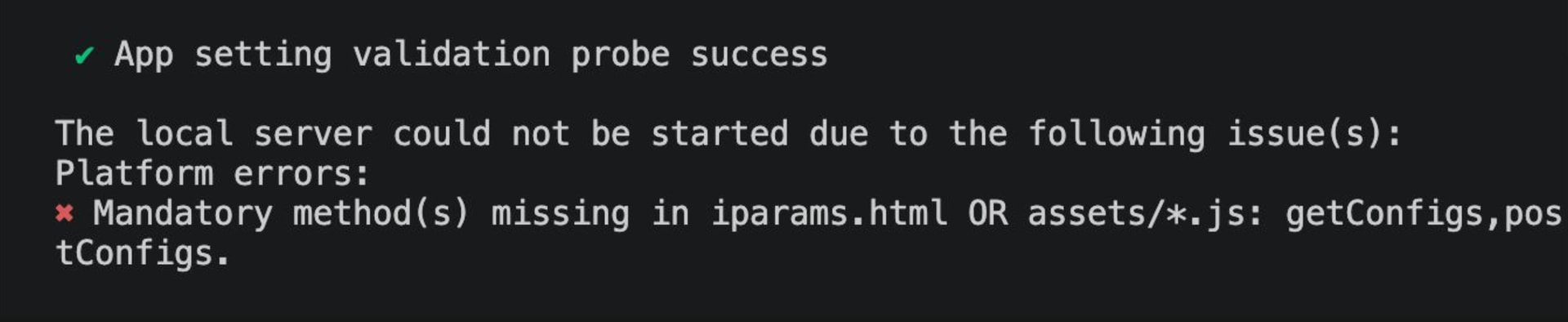 However, when I try to pack the app, it fails saying that the madatory methods getConfigs, postConfigs and validate are not defiend.