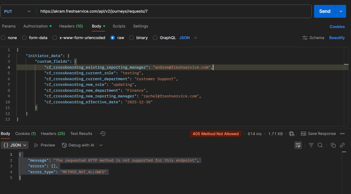 According to the API documentation, the “Update Journey Request” endpoint specifies the use of the PUT method. However, when I attempt a PUT request, I receive the following error response: