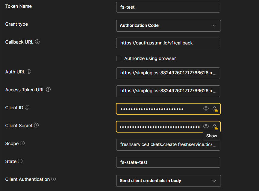 I am trying to set up OAuth 2.0 authorization for Freshservice using Postman.